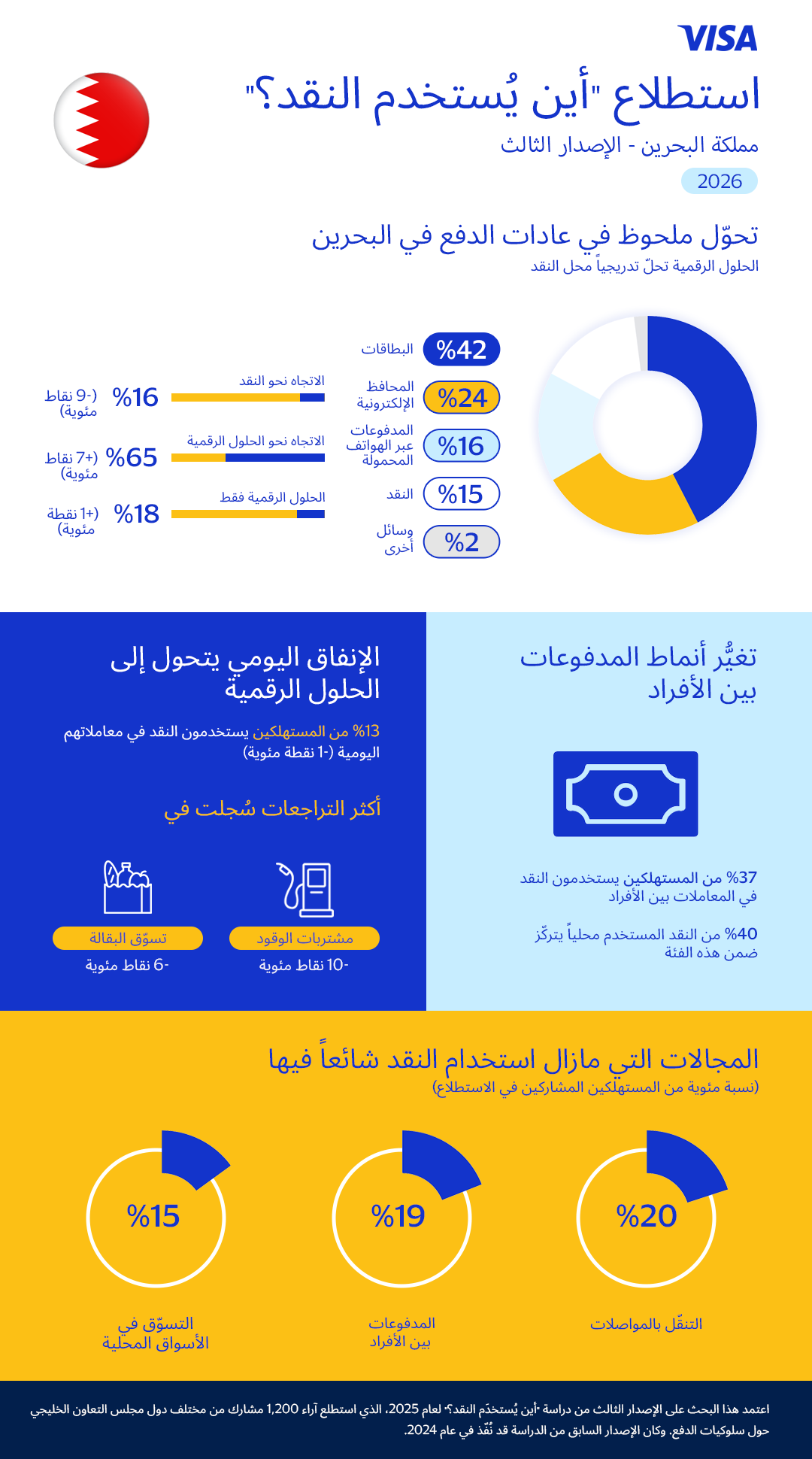 المنامة، مملكة البحرين، 21 يناير 2026: تواصل عادات الدفع في مملكة البحرين تطوّرها بوتيرة متسارعة، مع اعتماد المستهلكين على وسائل الدفع الرقمية الأسرع والأكثر أماناً. ويظهر الإصدار الثالث من استطلاع Visa "أين يُستخدَم النقد؟"¹، أنّ 65% من المستهلكين في البحرين يعتمدون بشكل أساسي على وسائل الدفع غير النقدية، أي أنهم ينفّذون معظم معاملاتهم باستخدام البطاقات أو الأجهزة المحمولة، وهو ما يمثل زيادة قدرها 7 نقاط مئوية مقارنة بالعام السابق، ما يعكس توجهاً واضحاً نحو تقليل الاعتماد على النقد.